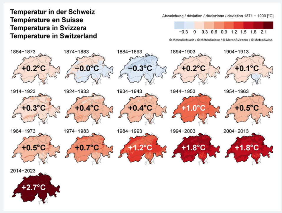 Global warming is progressing twice as fast in Switzerland as on a global level. Due to its geographical location, the average temperature has risen by more than 2°C since 1864 compared to the global 1°C.