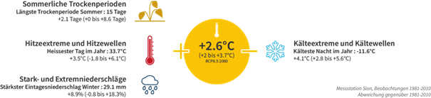 The effects of climate change are particularly noticeable in the Alpine cantons and pose challenges for alpine communities. If no action is taken, the average temperature in Valais could rise by a further 3°C by 2060 compared to the period 1981 - 2010. The rise in temperature is accompanied by long periods of drought, extreme heat waves and heavy and extreme precipitation leading to forest fires and/or flooding. In addition, the zero degree latitude mark is rising, it is less cold in winter and the number of snow days is decreasing.