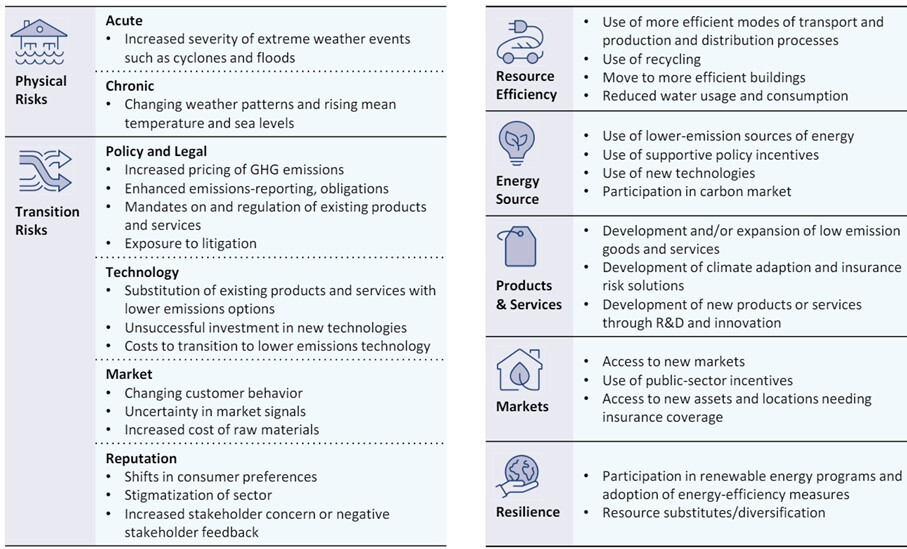 The TCFD also emphasizes on the transmission paths that climate risk and opportunities can take in order to impact business. The following diagram depicts this transmission channel very clearly: