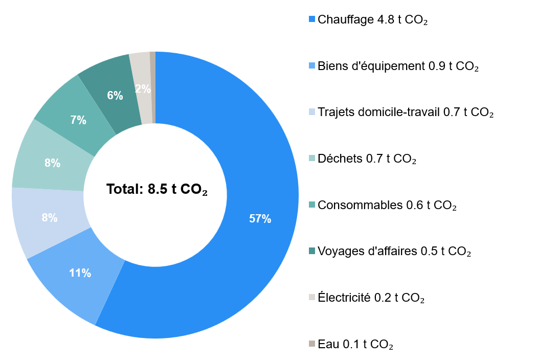 Au cours de l'exercice 2024, les émissions totales se sont élevées à 8,5 tonnes d'équivalent CO₂ pour 36,8 équivalents temps plein, ce qui correspond à 0,2 tonne de CO₂ par collaborateur. Par rapport à l'année précédente, les émissions ont été considérablement réduites : -26 % en valeur absolue et -34 % par ETP. Parmi les principaux facteurs d'émissions figuraient le chauffage, les biens d'équipement et les trajets domicile-travail des collaborateurs.